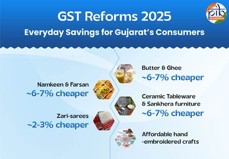 हाल ही में हुए जीएसटी सुधारों से गुजरात पर बड़ा प्रभाव दिखने की उम्मीद है, क्योंकि गुजरात की अर्थव्यवस्था मैन्युफैक्चरिंग, औद्योगिक उत्पादन, कृषि और डेयरी, पारंपरिक शिल्प जैसे संबंधित क्षेत्रों और वैश्विक निर्यात के मिश्रण पर आधारित है। जरूरी वस्तुओं और पारंपरिक उत्पादों पर दरें घटाकर, औद्योगिक इनपुट और व्यापार सुविधा उपायों में राहत प्रदान कर, इन सुधारों से राज्य की अर्थव्यवस्था को बहुत प्रोत्साहन मिलने की उम्मीद है।