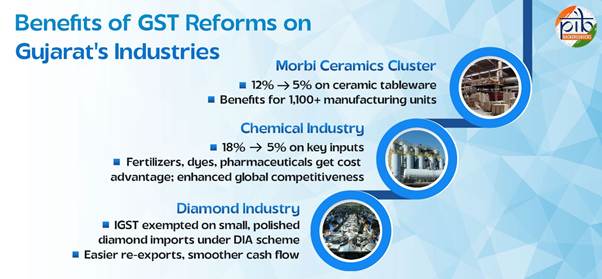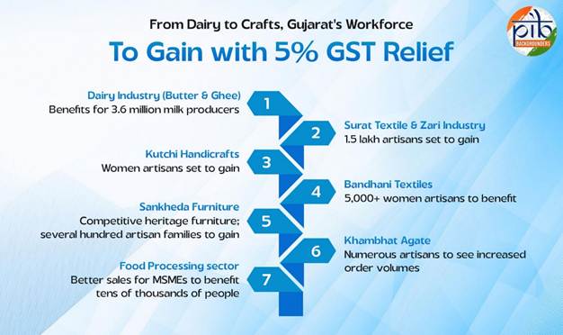 जीएसटी दरों के सुव्यवस्थीकरण से गुजरात के सबसे महत्वपूर्ण क्षेत्रों में बड़ी राहत मिलने की उम्मीद है, जिससे ग्रामीण आजीविका, औद्योगिक विकास और वैश्विक प्रतिस्पर्धात्मकता को एक साथ जोड़ा जा सकेगा। इन उपायों से न केवल घरेलू बचत और ग्राहकों की खरीदने की क्षमता में बढ़ोतरी होगी, बल्कि आय और निर्यात में भी बढ़ोतरी होगी।