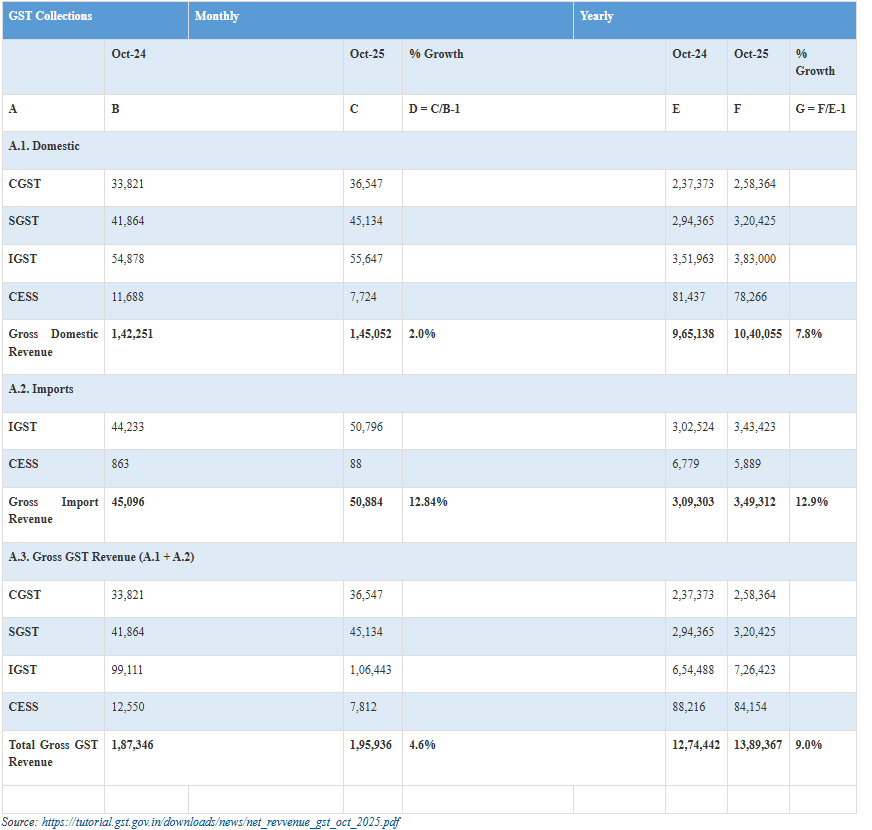 ২০২৫ সালের অক্টোবর মাসে মোট পণ্য ও পরিষেবা কর অর্থাৎ, জিএসটি রাজস্ব আদায় হয়েছে ১,৯৫,৯৩৬ কোটি টাকা, যা গত বছরের একই মাসের ১,৮৭,৩৪৬ কোটি টাকার তুলনায় ৪.৬% বৃদ্ধি নথিভুক্ত করেছে।