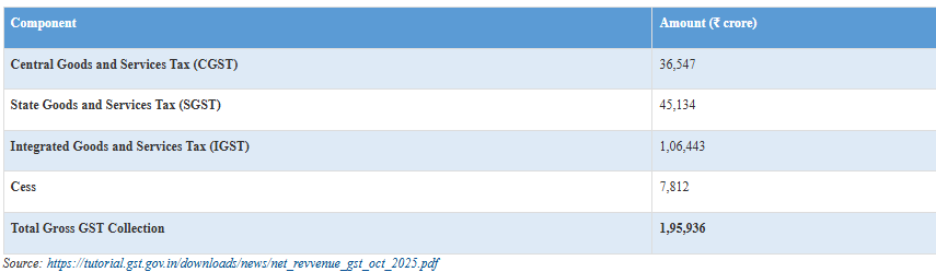 ২০২৫ সালের অক্টোবর মাসে মোট জিএসটি সংগ্রহ করা হয়েছে ১,৯৫,৯৩৬ কোটি টাকা।