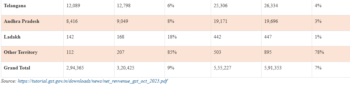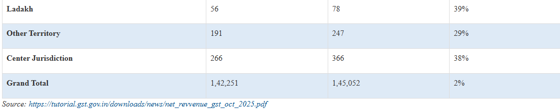 দেশের মোট জিএসটি রাজস্ব ২.০% বৃদ্ধি পেয়েছে, যা অক্টোবর ২০২৪-এ ১,৪২,২৫১ কোটি টাকা থেকে বৃদ্ধি পেয়ে অক্টোবর ২০২৫-এ ১,৪৫,০৫২ কোটি টাকা হয়েছে।