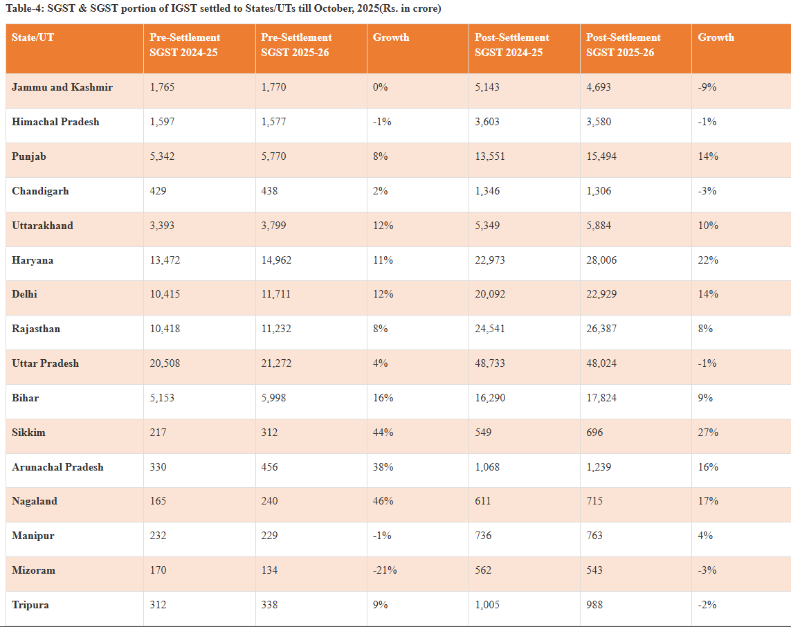 সারণি-৩ এ অক্টোবর ২০২৫ চলাকালীন রাজ্যভিত্তিক জিএসটি রাজস্ব বৃদ্ধির প্রবণতা দেখানো হয়েছে (এতে পণ্য আমদানির উপর জিএসটি অন্তর্ভুক্ত নয়)। সারণি-৪ এ অক্টোবর ২০২৫ মাস পর্যন্ত রাজ্যভিত্তিক প্রাক্-নিষ্পত্তি এবং নিষ্পত্তি-পরবর্তী জিএসটি রাজস্বের পরিমাণ কোটি টাকায় দেখানো হয়েছে। উল্লেখ্য যে, নিষ্পত্তি-পরবর্তী জিএসটি হল রাজ্য/কেন্দ্রশাসিত অঞ্চলগুলির নিজস্ব জিএসটি রাজস্ব এবং সেই রাজ্য/কেন্দ্রশাসিত অঞ্চলগুলিতে নিষ্পত্তি হওয়া আইজিএসটি-এর এসজিএসটি অংশের সম্মিলিত যোগফল।