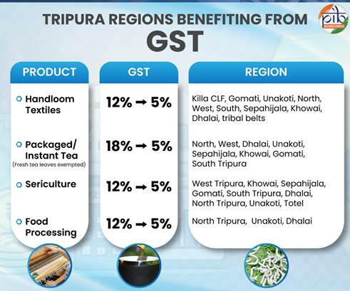 - The GST cuts from 12% to 5% boost the competitiveness of Tripura’s handlooms, tea, sericulture, and food processing sectors, driving rural livelihoods and expanding market reach.