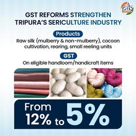 The recent GST rate reduction adds further momentum to this traditional industry. The tax cut from 12% to 5%- roughly a 6.25% effective benefit on eligible handloom and handicraft items- makes silk-based products from Tripura more affordable and market-competitive. This easing of the tax burden helps small producers expand market reach, strengthen income stability, and promote sustainable growth of sericulture as a key pillar of Tripura’s rural economy.