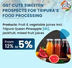 Recent GST revisions further strengthen this value chain. The tax rate on fruit and vegetable juices, including Tripura Queen Pineapple juice, jackfruit, and mixed fruit juices, has been reduced from 12% to 5%: a 7 percentage-point cut. This change significantly lowers output taxes for bottled juices and pulp, making local products more affordable and competitive. By easing tax pressures, the reform encourages processing, packaging, and exports, helping Tripura’s fruit sector evolve from farm-based production to a more value-driven, market-oriented ecosystem.