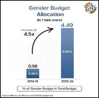 भारत में लैंगिक बजट के लिए वर्ष 2014-15 से 2025-26 तक आवंटन में उल्लेखनीय वृद्धि हुई है। परिव्यय वर्ष 2014-15 में 0.98 लाख करोड़ रुपए से बढ़कर वर्ष 2025-26 में 4.49 लाख करोड़ रुपए हो गया है, केंद्रीय बजट में लैंगिक बजट का प्रतिशत हिस्सा वित्त वर्ष 2025-26 में 8.86 प्रतिशत तक बढ़ गया है, जो 2014-15 में 5.46 प्रतिशत था। यह सार्वजनिक व्यय के माध्यम से लैंगिक समानता को आगे बढ़ाने के सरकार की निरंतर प्रतिबद्धता को दर्शाता है।