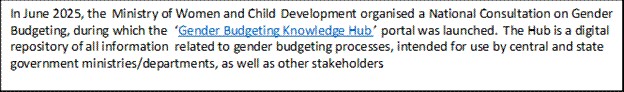 - महिला एवं बाल विकास मंत्रालय द्वारा मैनुअल, हैंडबुक और प्रशिक्षण जैसी क्षमता निर्माण पहलों ने लैंगिक बजट में तकनीकी विशेषज्ञता को मजबूत किया है।