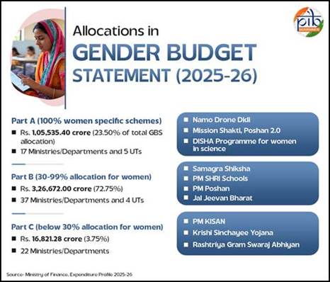 - केंद्रीय बजट में लैंगिक बजट विवरण (जीबीएस) को अनिवार्य रूप से शामिल करने से महिलाओं और लड़कियों के लिए आवंटन की नियमित जांच सुनिश्चित होती है।