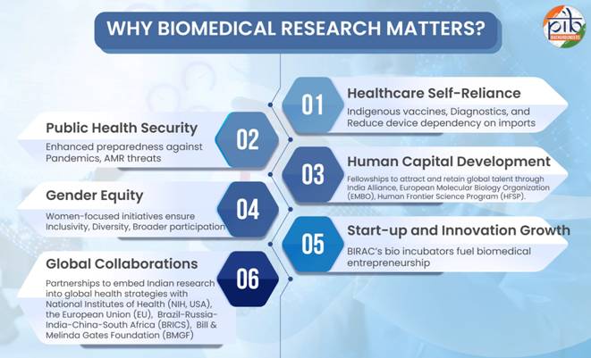 भारतमा जैवचिकित्सा अनुसन्धानले पहिले नै ठोस परिणाम दिन थालेको छ। सीआरआईएसपीआर आधारित किटहरू र डेंगुका लागि चाँड़ो परीक्षण जस्ता किफायती निदान प्रविधिहरू, निमोनिया, खोपिरा-रुबेला, र कोभिड-१९ विरुद्धका स्वदेशी खोपहरू, र जिनोमीइण्डिया परियोजनाबाट प्रेरित उपचारहरू, किफायती इम्प्लान्ट, भेन्टिलेटर, र पीपीईले आयातमा निर्भरता घटाइरहेको छ। जबकि राष्ट्रिय एएमआर ट्रायकिङ, रोग डेटाबेसहरू र बायोरिपोजिटोरीहरूले सार्वजनिक स्वास्थ्य प्रणालीहरूलाई सुदृढ बनाइरहेको छ। यससँगै, न्यूट्रास्युटिकल्स र जैव सक्रिय यौगिकहरूमा भइरहेको अनुसन्धानले पोषण र रोकथाममुखी स्वास्थ्य सेवामा सुधार गरिरहेको छ।