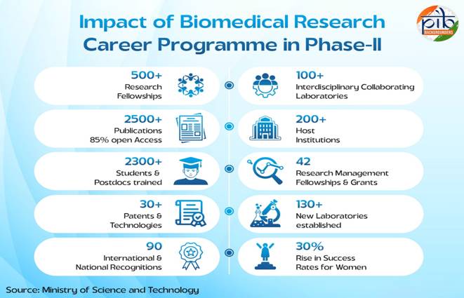 यस गतिलाई अघि बढाउँदै केन्द्रीय मन्त्री परिषद्ले जैवचिकित्सा अनुसन्धान करियर कार्यक्रम (बीआरसीपी) को तेस्रो चरण २०२५–२६ देखि २०३०–३१ सम्म कार्यान्वयन गर्ने स्वीकृति दिएको छ, जसको सेवा अवधि २०३७–३८ सम्म रहनेछ। बीआरसीपीको उद्देश्य जैवचिकित्सा विज्ञान, क्लिनिकल, र सार्वजनिक स्वास्थ्य अनुसन्धानमा विश्वस्तरीय अनुसन्धान वातावरण तयार गर्नु हो। यो कार्यक्रमले विभिन्न चरणका वैज्ञानिकहरूलाई फेलोशिप र सहकार्य अनुदानमार्फत समर्थन गर्छ, जसले विशेष गरी भारतका प्रमुख सार्वजनिक स्वास्थ्य चुनौतीहरू समाधान गर्न उच्च-स्तरीय, नैतिक अनुसन्धानलाई प्रोत्साहित गर्दछ। यसले विविधता, समावेशिता, र अन्तर्राष्ट्रिय प्रतिस्पर्धात्मकतालाई प्रोत्साहन गर्नुका साथै अनुसन्धानलाई कार्य, नवप्रवर्तन, र नीतिगत परिवर्तनमा रुपान्तरण गर्न सहयोग गर्दछ। जैवप्रौद्योगिकी विभागले युकेको वेलकम ट्रस्टसँग सहकार्य गर्दै २००८–०९ मा मन्त्री परिषद्को स्वीकृतिका साथ "डीबीटी/वेलकम ट्रस्ट इण्डिय एलायन्स" नामक विशेष प्रयोजन सवारी मार्फत बीआरसीपी शुरू गरेको थियो। यसले भारतमै आधारित रहेर विश्वस्तरीय जैवचिकित्सा अनुसन्धानका लागि अनुसन्धान फेलोशिपहरू प्रदान गरेको छ। पछि दोस्रो चरणको कार्यक्रम २०१८–१९ मा विस्तारित दायरासहित कार्यान्वयन गरिएको थियो, र अहिले तेस्रो चरणलाई मन्त्री परिषद्ले स्वीकृति दिएको छ।