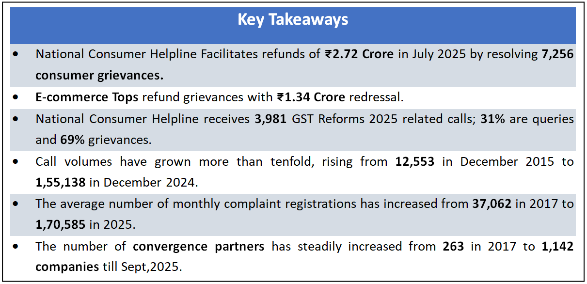 Helpline is a flagship initiative of the Department of Consumer Affairs to guide consumers, resolve grievances and create awareness about their rights. It operates through the portal consumerhelpline.gov.in, which functions as the Integrated Grievance Redress Mechanism. The platform brings together consumers, government agencies, regulators, ombudsmen, companies and call centres on a single system.