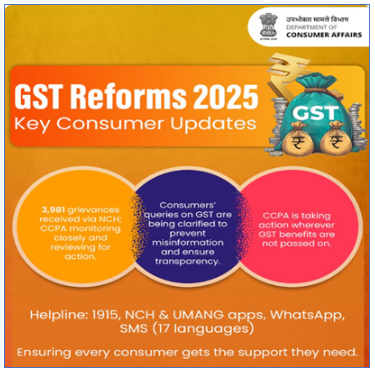 •2025 ലെ ജിഎസ്ടി പരിഷ്കാരങ്ങളുമായി ബന്ധപ്പെട്ട് ദേശീയ ഉപഭോക്തൃ ഹെൽപ്പ്ലൈനിന് 3,981 കോളുകൾ ലഭിച്ചു; ഇതിൽ 31% അന്വേഷണങ്ങളും 69% പരാതികളുമാണ്.