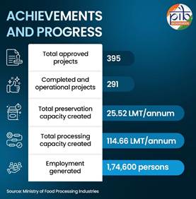 - 2008 से, 395 कोल्ड चेन परियोजनाओं को मंज़ूरी दी गई है; इनमें से 291 पूरी हो चुकी हैं और चालू हैं, जिससे सालाना 25.52 लाख मीट्रिक टन संरक्षण और 114.66 लाख मीट्रिक टन प्रसंस्करण क्षमता का सृजन हुआ है। इससे 1.74 लाख रोज़गार तैयार हुए हैं।