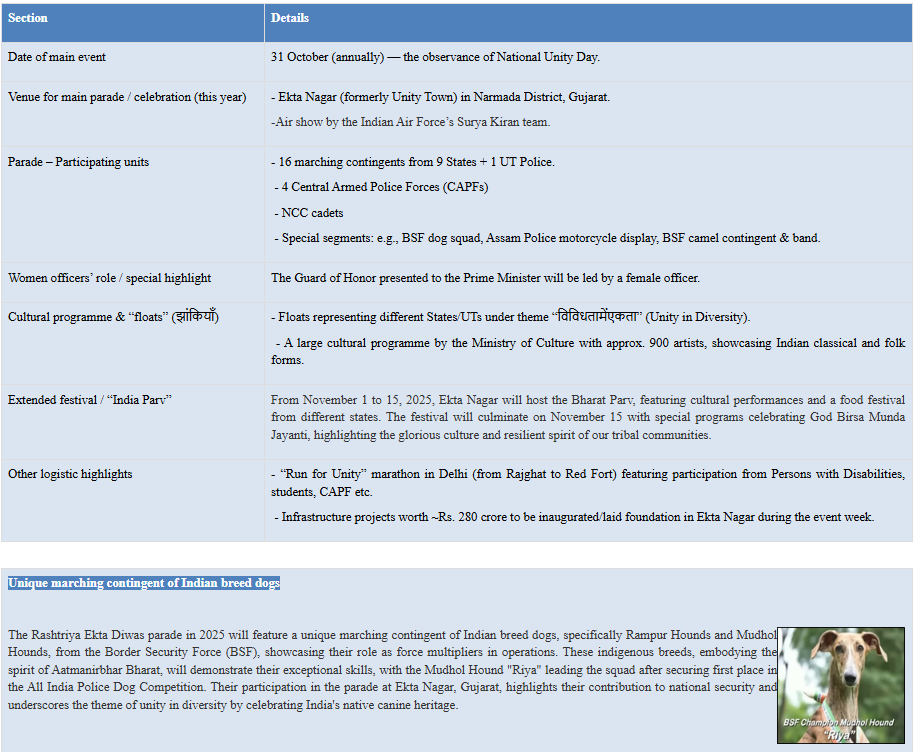 এই দিবসের অনুষ্ঠানে ঐতিহাসিক শ্রদ্ধা যেমন রয়েছে, তেমনই রয়েছে শপথ, পদযাত্রা ও সাংস্কৃতিক কর্মসূচির মাধ্যমে সমসাময়িক নাগরিকদের স্বক্রিয় অংশগ্রহণ। এই উদযাপন কেবল অতীতের কৃতিত্ব স্মরণ নয়, এটি আধুনিক বিভাজনের প্রবণতাকেও প্রতিহত করে “এক ভারত, শ্রেষ্ঠ ভারত”-এর আদর্শকে বাস্তবায়িত করে।