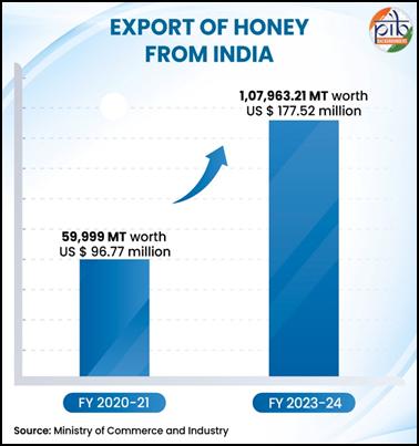 भारतले वित्त वर्ष 2023-24 मा 177.52 मिलियन अमेरिकी डलर मूल्य बराबरको लगभग 1.07 लाख मेट्रिक टन (एमटी) प्राकृतिक मह निर्यात गऱ्यो। वित्त वर्ष 2020-21 पछिबाट निर्यातमा यो एक सराहनीय वृद्धि हो, जब भारतले 96.77 मिलियन अमेरिकी डलर मूल्यको 59,999 मेट्रिक टन प्राकृतिक मह निर्यात गरेको थियो।
