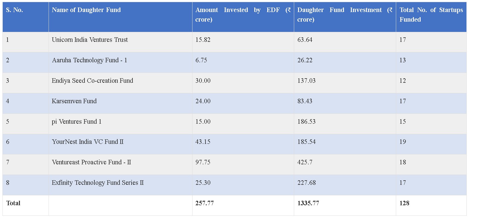 এই ডটার ফান্ডগুলো ১২৮-টি স্টার্টআপে ₹১,৩৩৫.৭৭ কোটি টাকা বিনিয়োগ করেছে।