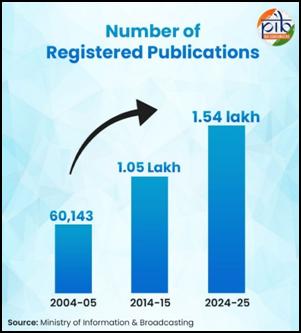 ভারতের প্রাণবন্ত গণমাধ্যম পরিসর ক্রমাগত বিস্তৃত হচ্ছে—নিবন্ধিত প্রকাশনার সংখ্যা ২০০৪–০৫ সালের ৬০,১৪৩ থেকে ২০২৪–২৫ সালে ১.৫৪ লক্ষে পৌঁছেছে, যা সংবাদমাধ্যমের ক্রমবর্ধমান শক্তি ও বিস্তৃতির স্পষ্ট প্রমাণ।