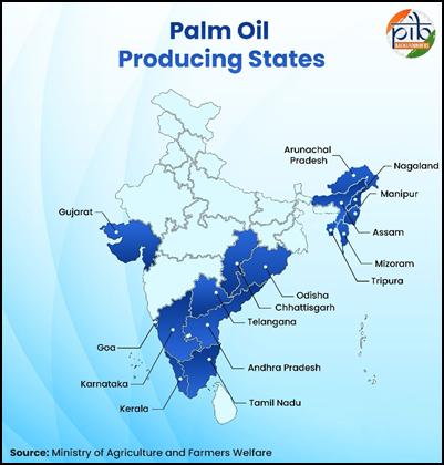 ২০২৫ সালের নভেম্বর মাস পর্যন্ত দেশে ২.৫০ লক্ষ হেক্টর জমিতে পাম চাষ হয়েছে, ফলে দেশে তেল পামের মোট চাষের ক্ষেত্র ৬.২০ লক্ষ হেক্টরে পৌঁছেছে। অপরিশোধিত পাম তেলের (CPO) উৎপাদন ২০১৪-১৫ সালের ১.৯১ লক্ষ টন থেকে বেড়ে ২০২৪-২৫ সালে ৩.৮০ লক্ষ টনে উন্নীত হয়েছে।
