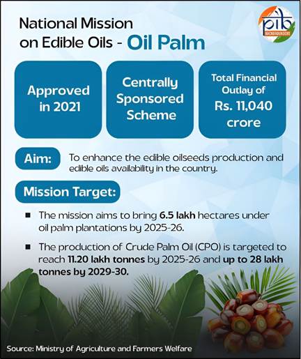 দেশে ভোজ্য তেলের চাহিদা বৃদ্ধি এবং আমদানির খরচ কমাতে, কেন্দ্রীয় পৃষ্ঠপোষকতায় জাতীয় ভোজ্য তেল মিশন - অয়েল পাম (NMEO-OP) ২০২১ সালে অনুমোদিত হয়। এর লক্ষ্য হল চাষের এলাকা বাড়িয়ে এবং অপরিশোধিত পাম তেল উৎপাদন বৃদ্ধি করে ভোজ্য তেলের উৎপাদন বাড়ানো ও আমদানিনির্ভরতা কমানো।