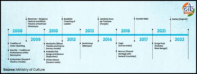 এই তালিকাভুক্তিগুলি বিভিন্ন সম্প্রদায়ের মানুষজনের অংশগ্রহণ ও সঞ্চারের মাধ্যমে বৈচিত্র্যময় সংস্কৃতি রক্ষার প্রতি ভারতের অঙ্গীকার প্রতিফলিত করে। ইউনেস্কোর এই তালিকায় কুটিয়াট্টম, ছৌ-এর মতো প্রাচীন পরিবেশন শিল্প থেকে শুরু করে বেদ পাঠ, কুম্ভ মেলা, রামলীলা, রাম্মন এবং যোগ, দুর্গাপূজা ও গরবার মতো সাংস্কৃতিক ঐতিহ্য পর্যন্ত বিস্তৃত ১৫-টি ঐতিহ্যগত বিষয় রয়েছে, যা ভারতের বিরাট সাংস্কৃতিক গভীরতা প্রদর্শন করে।