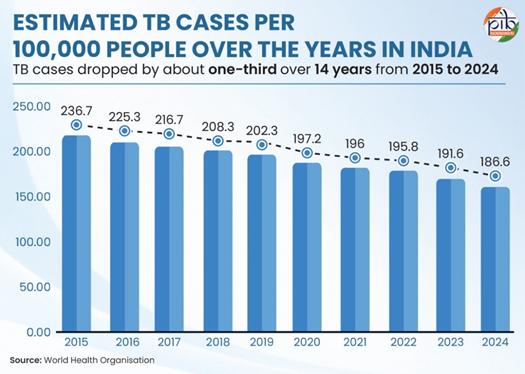 · TB incidence in India drops by 21% from 237 per lakh population in 2015 to 187 per lakh population in 2024 – almost double the rate of decline observed globally: https://www.pib.gov.in/PressReleasePage.aspx?PRID=2189415