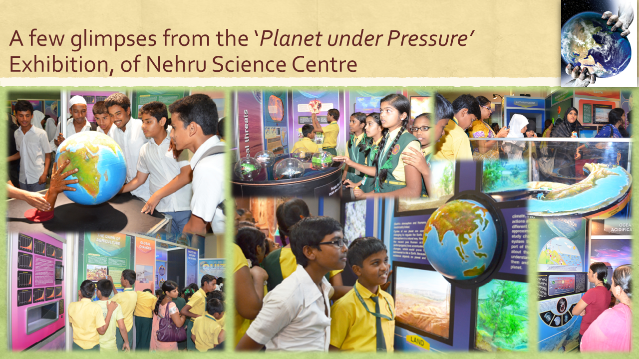 The exhibit was produced as part of an exhibition put up by the Centre, by the name “Planet under Pressure”. Through the exhibition, Nehru Science Centre (National Council of Science Museums) aims to sensitize the public and create awareness that the time for action is now for generating a momentum for the major transformation required for a truly sustainable planet.