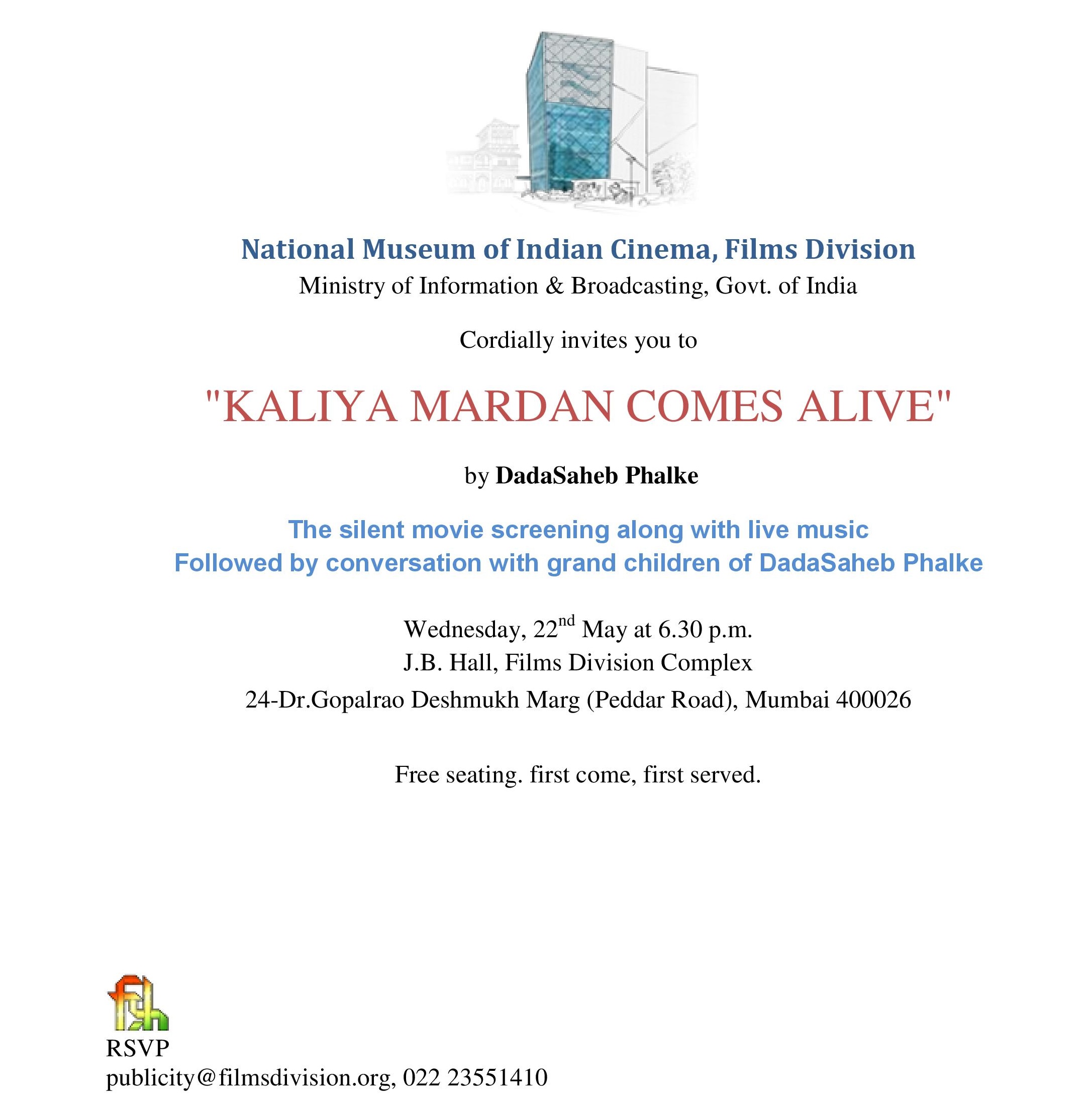 Screening of the film, loaned by NFAI, will be accompanied by live music directed by well-known flautist Pandit Sunil Kant Gupta along with senior musicians, Sri Narayani Mani (Veena), Pandit Shyamakant Paranjpe (Synthesiser), Shri Prasad Rahane (Sitar) and Pandit Kalinath Mishra (Tabla, Pakhawaj and Padhant). The screening will be preceded by felicitation of Chandrasekhar Pusalkar and Mrudula Pusalkar, grandson and grand daughter-in-law of Dada Phalke and Pankaj Parashar, filmmaker who have donated artefacts and costumes to the Museum by Shri Prashant Pathrabe, Director General, Films Division. A Q&A session will be followed by the screening. The event is free and admission will be on first come first served basis.