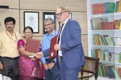 An MOU has been signed between All India Institute of Ayurveda (AIIA) under Ministry of AYUSH and Frankfurter Innovationszentrum Biotechnologie GmbH (FiZ) here today. The MoU signed by Prof. Tanuja Nesari Director AIIA and Dr Christian Garbe, Managing Director of Frankfurter Innovationszentrum Biotechnologie GmbH (FiZ), was agreed at FiZ on the occasion of the event “German/Indian knowledge exchange regarding current developments in the health care sector” by Dr Garbe with Vaidya Rajesh Kotecha, Secretary, Ministry of AYUSH, during September of this year.