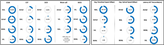 Drop Call Rate: Airtel, BSNL, RJIL and VIL have drop callrateof0.00%,4.25%,0.16%and2.94%respectivelyin Auto-selection mode (5G/4G/3G/2G).
