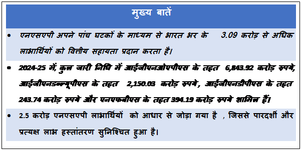 राष्ट्रीय सामाजिक सहायता कार्यक्रम भारत की सामाजिक सुरक्षा प्रणाली के एक प्रमुख स्तंभ के रूप में कार्य करता है, जो जरूरतमंद नागरिकों को आवश्यक सहायता प्रदान करता है। अपने विभिन्न घटकों-इंदिरा गांधी राष्ट्रीय वृद्धावस्था पेंशन योजना, इंदिरा गांधी राष्ट्रीय विधवा पेंशन योजना, इंदिरा गांधी राष्ट्रीय निःशक्त पेंशन योजना, अन्नपूर्णा योजना और राष्ट्रीय परिवार लाभ योजना के माध्यम से, कार्यक्रम यह सुनिश्चित करता है कि बुजुर्ग नागरिक, विधवा, दिव्यांग व्यक्तियों और परिवार के मुख्य कमाने वाले सदस्य को खोने वाले परिवारों को नियमित वित्तीय सहायता और खाद्य सुरक्षा मिले। आधार ऑथेंटिकेशन को एकीकृत करके और प्रत्यक्ष लाभ हस्तांतरण को बढ़ावा देकर, एनएसएपी ने पारदर्शिता में सुधार किया है, धोखाधड़ी को कम किया है और लाखों लाभार्थियों तक कल्याणकारी योजनाओं के वितरण को मजबूत किया है। सामूहिक रूप से, ये उपाय महत्वपूर्ण वित्तीय राहत प्रदान करते हैं और देश भर में एक अधिक समावेशी और समान सामाजिक सुरक्षा में योगदान देते हैं।