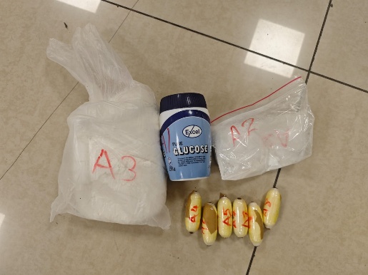 Acting on specific intelligence, DRI officers intercepted the passenger upon her arrival. Detailed examination of her baggage led to the recovery of 2 food packets containing white powder, 1 plastic container containing white powder and 1 pouch was found containing pellets containing white powdery substance. Officers also recovered two capsules that had been ingested by the passenger. Testing of the recovered substances, using NDPS field test kit, showed positive results for Cocaine.