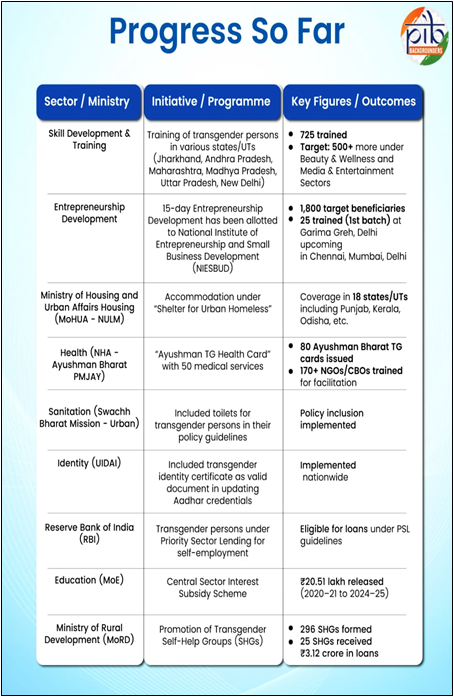 - Providing gender-affirming care, HIV surveillance, counseling, and integration with the Ayushman Bharat – Pradhan Mantri Jan Arogya Yojana (PM-JAY) for free medical coverage, upholding the right to health under Article 21 of the Constitution.