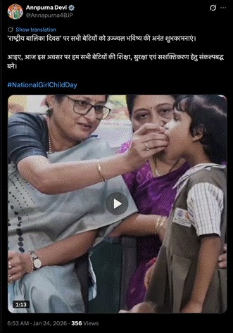 महिला एवं बाल विकास मंत्री श्रीमती अन्नपूर्णा देवी ने ‘राष्ट्रीय बालिका दिवस’पर देश की बेटियों को उज्ज्वल भविष्य की अनंत शुभकामनाएँ दीं।