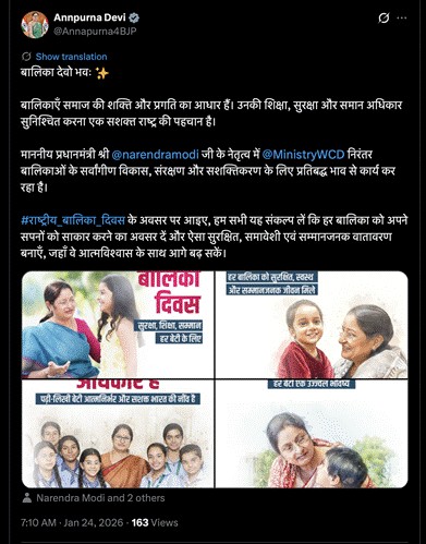 सोशल मीडिया प्लेटफ़ॉर्म ‘X’ पर उन्होंने कहा, “बालिका देवो भवः | बालिकाएँ समाज की शक्ति और प्रगति का आधार हैं। उनकी शिक्षा, सुरक्षा और समान अधिकार सुनिश्चित करना एक सशक्त राष्ट्र की पहचान है।