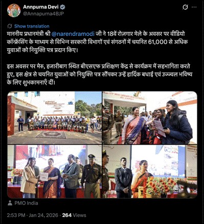 श्रीमती अन्नपूर्णा देवी ने सोशल मीडिया प्लेटफ़ॉर्म ‘X’ पर कहा, “माननीय प्रधानमंत्री श्री नरेंद्र मोदी जी ने 18वें रोज़गार मेले के अवसर पर वीडियो कॉन्फ्रेंसिंग के माध्यम से विभिन्न सरकारी विभागों एवं संगठनों में चयनित 61,000 से अधिक युवाओं को नियुक्ति पत्र प्रदान किए|