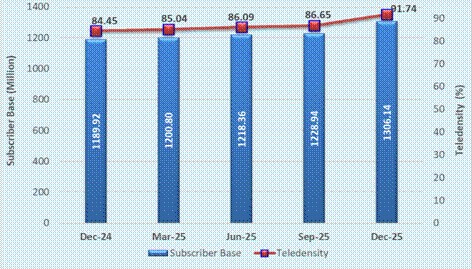 - वायरलेस (मोबाइल + एफडब्ल्यूए) टेली-डेंसिटी सितंबर-25 के अंत में 83.36 प्रतिशत से बढ़कर दिसंबर-25 के अंत में 88.41 प्रतिशत हो गई, जिसमें तिमाही वृद्धि दर 6.05 प्रतिशत रही।