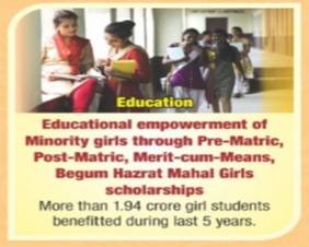 Socio-Economic-Educational Empowerment of Minority Women:Pre-Matric Scholarship Scheme, Post-Matric Scholarship Scheme, Merit-cum-Means based Scholarship Scheme - For educational empowerment of students; Begum Hazrat Mahal National Scholarship for Meritorious Girls belonging to the Minorities. More than 1.94 Crore girl students have benefitted during the last 5 years.