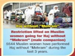 Haj without “Mehram: Restrictions lifted on Muslim women going for Haj without “Mehram” (male companion). 5,544 Muslim women have performed Haj without “Mehram” during the last three (3) years.