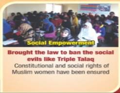 Social Empowerment: Brought the law to ban the social evils like Triple Talaq. Constitutional and Social rights of Muslim women have been ensured.