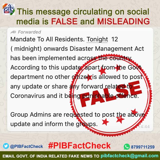 তথ্য আৰু সম্প্ৰচাৰ মন্ত্ৰালয়ৰ অধীনত প্ৰেছ ইনফ’ৰ্মেছন ব্যুৰ’ই ‘ক’ভিড-১৯ ফেক্ট চেক’ শীৰ্ষক এক প’ৰ্টেল মুকলি কৰিছে য’ত ইমেইল যোগে বাৰ্তা লাভ হ’ব আৰু ইয়াৰ উত্তৰ তাৎক্ষণিকভাৱে প্ৰদান কৰা হ’ব৷ প্ৰেছ ইনফ’ৰ্মেছন ব্যুৰ’ই প্ৰতিদিনে সন্ধিয়া ৮ বজাত এখন বুলেটিন প্ৰস্তুত কৰিব য’ত ক’ভিড-১৯ সন্দৰ্ভত চৰকাৰে গ্ৰহণ কৰা বিভিন্ন পদক্ষেপসমূহৰ বিষয়ে উল্লেখ থাকিব৷