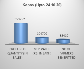 ఎంఎస్పి ఆధ్వర్యంలో పత్తి (కపాస్) సేకరణ కార్యకలాపాలు పంజాబ్, హర్యానా, రాజస్థాన్, మధ్యప్రదేశ్ రాష్ట్రాల్లో సజావుగా జరుగుతున్నాయి. 24.10.2020 వరకు రూ .104790.17 లక్షల విలువైన 353252 కాటన్ బేళ్లను సేకరించి 68419 మంది రైతులకు లబ్ధి చేకూర్చారు.
