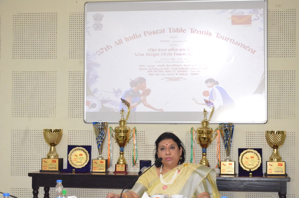 Ms. J. Charukesi, Chief Postmaster General, West Bengal Circle and president West Bengal Circle, Postal Sports Board briefing the media on 37th All India Postal Table Tennis tournament being organized by West Bengal Circle Postal Sports Board from November 17 to 21, 2021 (at Sports Authority of India (SAI), Netaji Subhash Eastern Centre, Salt Lake, Kolkata-700106) in Kolkata on November 16, 2021