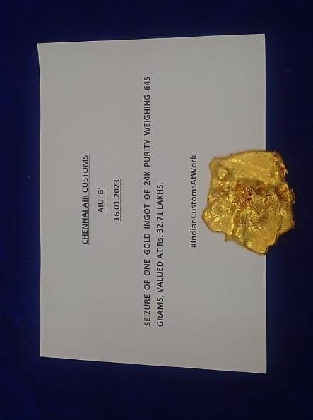 16.01.2023 அன்று உளவுத் தகவல் அடிப்படையில் மேற்கொள்ளப்பட்ட சோதனையின் போது ஆண் பயணி ஒருவர் 645 கிராம் எடை கொண்ட 24 கேரட் சுத்தத் தங்கத்தை பசை வடிவில் கொண்டு வந்தது கண்டறியப்பட்டு அது பறிமுதல் செய்யப்பட்டது .