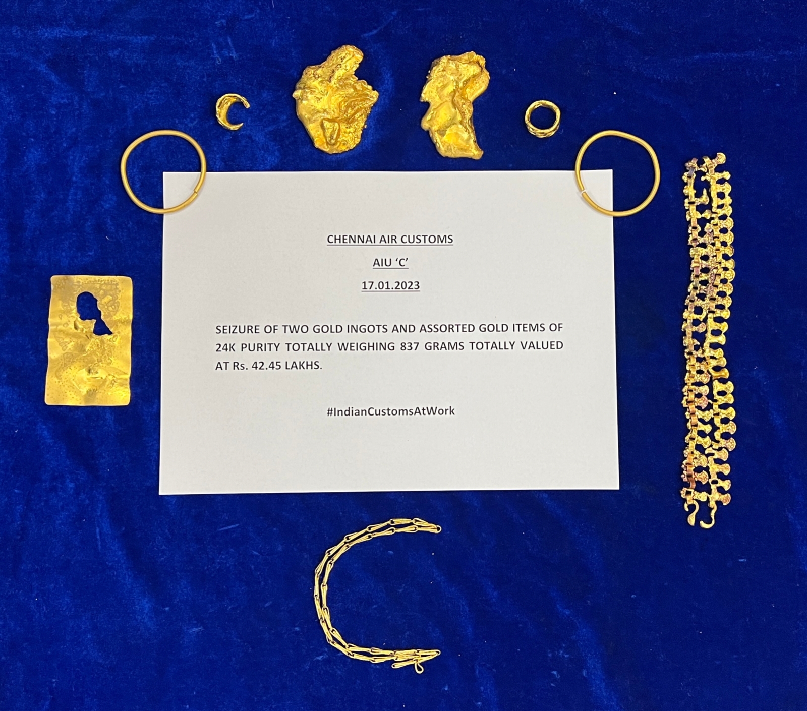 16.01.2023 அன்று மேற்கொள்ளப்பட்ட மற்றொரு சோதனையின் போது கொழும்பிலிருந்து வந்த இரு பெண் பயணிகளிடமிருந்து 5 பைகளிலிருந்து பசை வடிவில் மற்றும் கட்டிகள் வடிவில் மொத்தம் 837 கிராம் எடையுள்ள 24 கேரட் சுத்தத் தங்கத்தை சுங்க அதிகாரிகள் பறிமுதல் செய்தனர்.