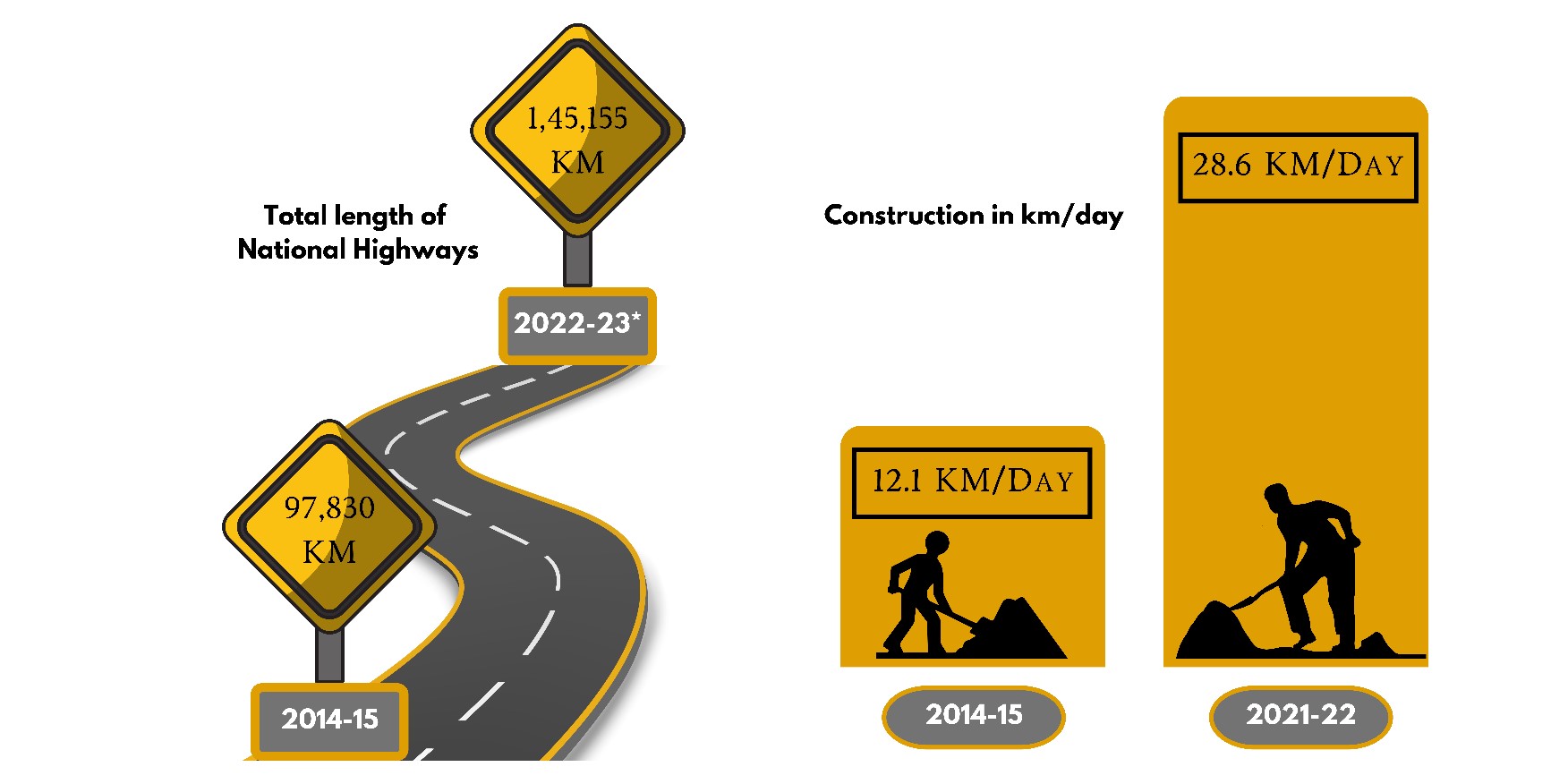 Government of India has implemented multiple initiatives in the last 9 years to augment the capacity of the National Highway infrastructure in the country. The pace of National Highways (NH) construction has increased consistently between 2014-15 and 2021-22 due to the systematic push through corridor-based National Highway development approach. In 2014-15, the pace of NH construction was about 12 km/ day, which increased to about 29 km/ day in 2021-22