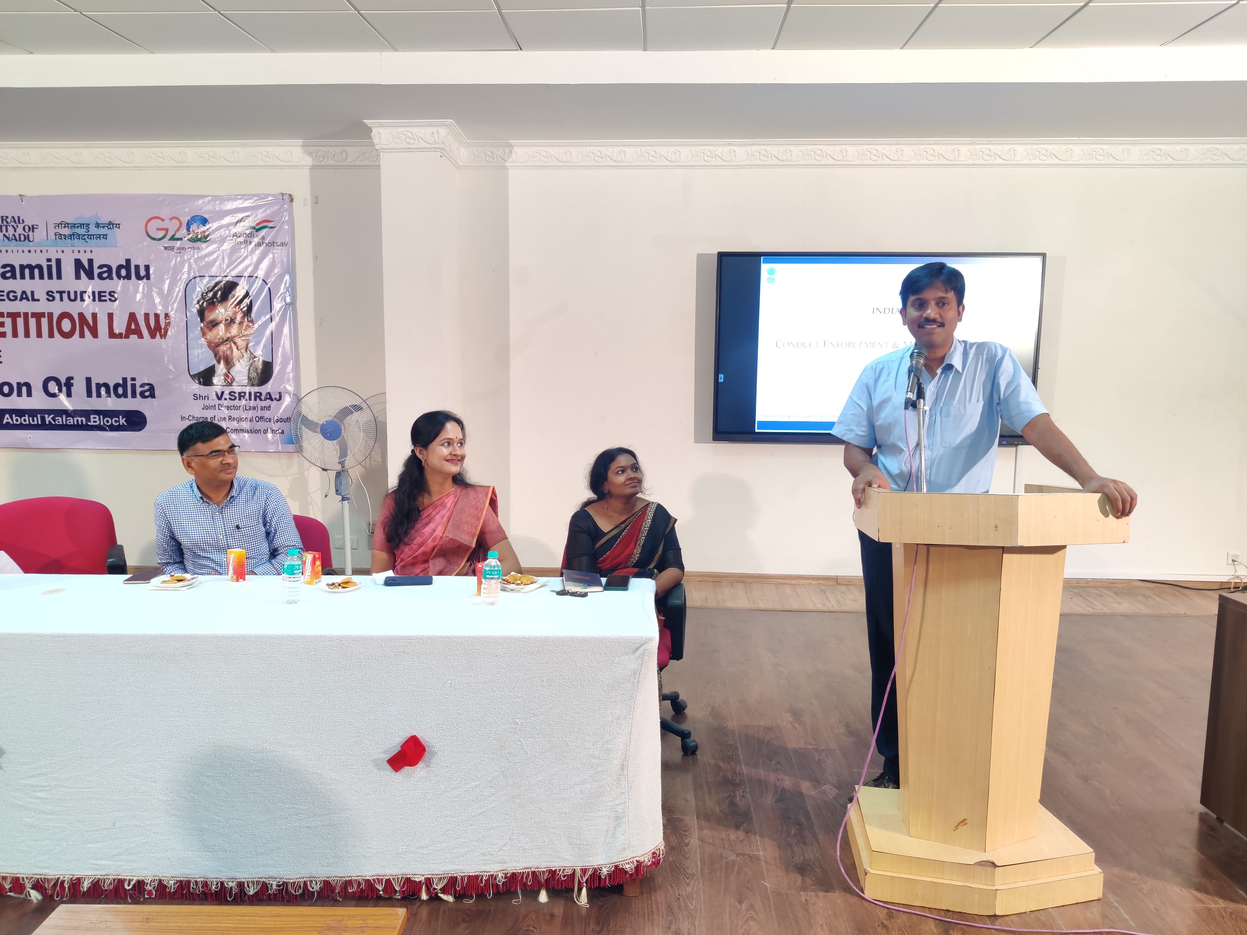 The Department of Law at the Central University of Tamil Nadu, in collaboration with the Competition Commission of India, hosted a Lecture Series program focused on the critical aspects of Competition Law. The event featured special lecture by V. Sriraj, Joint Director (Law) and in-charge, Regional Office (South), Competition Commission of India. Mr. Sriraj delivered two insightful lectures on "Conduct Enforcement: Abuse of Dominance" and "Anti-Competitive Agreement and Combination."
