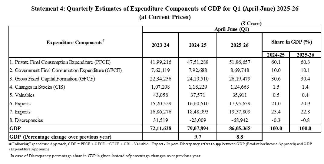 राष्ट्रिय साङ्ख्यिकी कार्यालय (एनएसओ), साङ्ख्यिकी तथा कार्यक्रम कार्यान्वयन मन्त्रालय (एमओएसपीआई) ले यस प्रेस नोटमा वित्तीय वर्ष (एफवाई) 2025-26 को अप्रेल-जून त्रैमासिक (क्यू1) को लागि सकल घरेलु उत्पाद (जीडीपी) को त्रैमासिक अनुमानका साथ-साथै स्थिर (2011-12) र वर्तमान मूल्यमा यसका व्यय घटकहरूलाई जारी गरिरहेको छ। विभिन्न आर्थिक क्षेत्रहरूको लागि मूल मूल्यहरूमा सकल मूल्य वर्धन (जीभीए) को त्रैमासिक अनुमान साथै वर्ष-दर-वर्ष प्रतिशत परिवर्तन, स्थिर र वर्तमान मूल्यहरूमा वित्त वर्ष 2023-24, 2024-25 र 2025-26 को पहिलो त्रैमासिकको लागि सकल घरेलु उत्पादको व्यय घटक, अनुलग्नक ‘ए’ को विवरण 1 देखि 4 मा दिइएको छ।