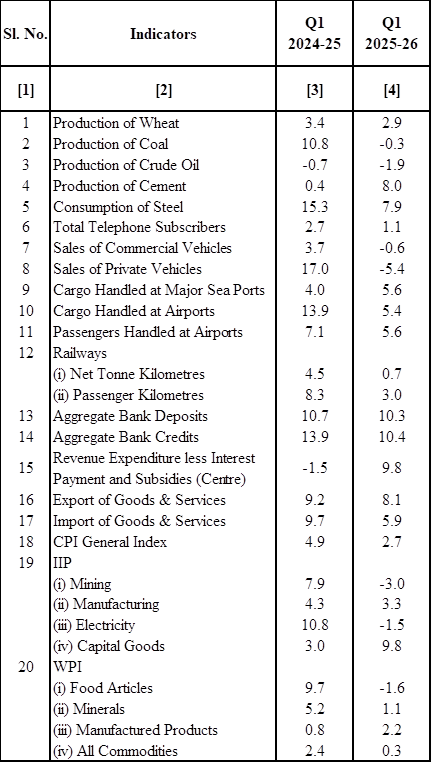 क्षेत्रगत अनुमानहरू सङ्केतकहरू प्रयोग गरेर सङ्कलित गरिएको छ, जस्तै (i) कृषि वर्ष (एवाई) 2025-26 को लागि फसल उत्पादन लक्ष्य र एवाई 2024-25 को लागि खाद्यान्न, तिलहन र अन्य व्यावसायिक फसलहरूको उत्पादनको तेस्रो अग्रिम अनुमान, (ii) एवाई 2024-25 को लागि बागवानी फसलहरूको क्षेत्र र उत्पादनको दोस्रो अग्रिम अनुमान, (iii) वित्त वर्ष 2025-26 को लागि प्रमुख पशुधन उत्पादहरूको ग्रीष्मकालीन ऋतुको अनुमान, (iv) वित्त वर्ष 2025-26 को पहिलो त्रैमासिकको लागि माछा उत्पादन अनुमान, (v) वित्त वर्ष 2025-26 को पहिलो त्रैमासिकको लागि यी कम्पनीहरूको उपलब्ध त्रैमासिक वित्तीय परिणामहरूको आधारमा सूचीबद्ध कम्पनीहरूको वित्तीय प्रदर्शन, (vi) कोइला, कच्चा पेट्रोलियम, प्राकृतिक ग्यास, सिमेन्टको उत्पादन र इस्पातको खपत, (vii) औद्योगिक उत्पादन सूचकाङ्क (आईआईपी), (viii) रेलवेको लागि नेट टन किलोमिटर र यात्री किलोमिटर, (ix) विमानस्थलहरूमा सम्हालिएको हवाई यात्री र कार्गो यातायात, (x) प्रमुख र साना समुद्री बन्दरगाहहरूमा सम्हालिएको कार्गो यातायात, (xi) व्यावसायिक वाहनहरूको बिक्री, (xii) ब्याङ्क जमा र क्रेडिट, (xiii) जीवन र गैर-जीवन बीमा कम्पनीहरूको प्रिमियम सम्बन्धी जानकारी, (xiv) वित्त वर्ष 2025-26 को पहिलो त्रैमासिकको लागि जीएसटीएनबाट उपलब्ध वस्तु र सेवाहरूको बाहिरी आपूर्ति, (xv) 2025-26 को पहिलो त्रैमासिकको लागि उपलब्ध केन्द्र र राज्य सरकारहरू आदिका खाता, (xvi) वित्त वर्ष 2025-26 को पहिलो त्रैमासिकको लागि वस्तु तथा सेवा कर सङ्कलन आदि। अनुमानमा प्रयोग गरिएका प्रमुख सङ्केतकहरूमा प्रतिबिम्बित वर्ष-दर-वर्ष वृद्धि दर (%) अनुलग्नक बी मा दिइएको छ।