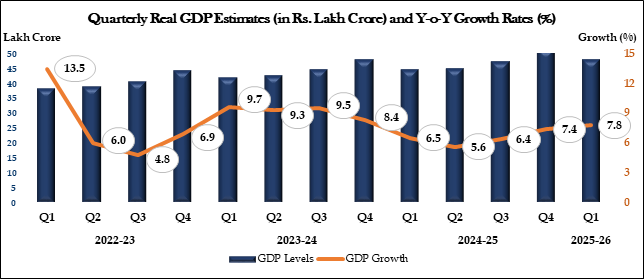 वित्त वर्ष 2024-25 को पहिलो त्रैमासिकमा सकल घरेलु उत्पाद (जीडीपी) मा 7.8% लको वृद्धिको अनुमान छ, जबकि वित्त वर्ष 2025-26 को पहिलो त्रैमासिकमा 6.5% को वृद्धि दर दर्ता गरिएको थियो।
