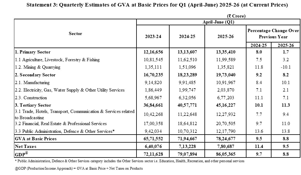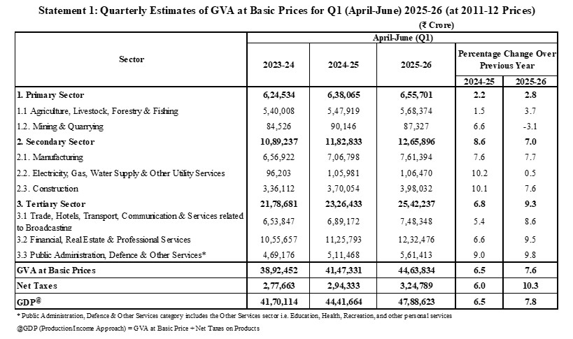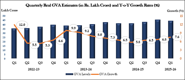 वित्त वर्ष 2025-26 को पहिलो त्रैमासिकमा वास्तविक सकल मूल्य संवर्धन (जीभीए) 44.64 लाख करोड रुपियाँ अनुमान गरिएको छ, जुन वित्त वर्ष 2024-25 को पहिलो त्रैमासिकमा 41.47 लाख करोड रुपियाँ थियो, जसले 7.6% वृद्धि दरलाई दर्शाउँछ। वित्त वर्ष 2025-26 को पहिलो त्रैमासिकमा नाममात्र जीभीए 78.25 लाख करोड रुपियाँ रहने अनुमान गरिएको छ, जुन वित्त वर्ष 2024-25 को पहिलो त्रैमासिकमा यो 71.95 लाख करोड रुपियाँ थियो, जसले 8.8% को वृद्धि दरलाई देखाउँछ।